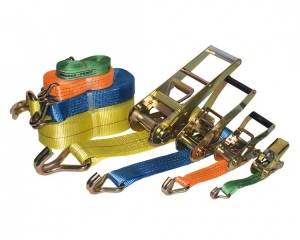 Материя стяжного ремня достаточно устойчива к воздействию жестких погодных условий, перепада температур, агрессивной среды и химических веществ, а также легко чистится и не истирается. Подходят такие ремни для различных видов грузов - листового металла, пиломатериалов, мебели и других.