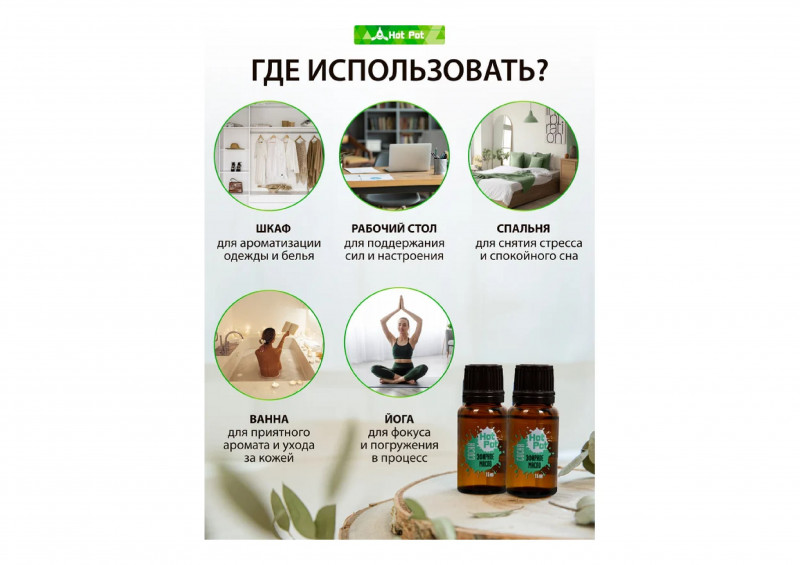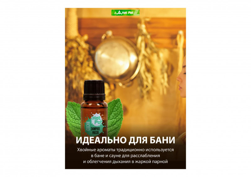 Эфирные масла «Hot Pot» сделают банные процедуры еще полезнее. Их аромат усиливает расслабляющее действие бани и сауны. Проникая с паром в кожу и кровь, масла избавляют от мышечного напряжения, ускоряют выведение токсинов и лишней жидкости.