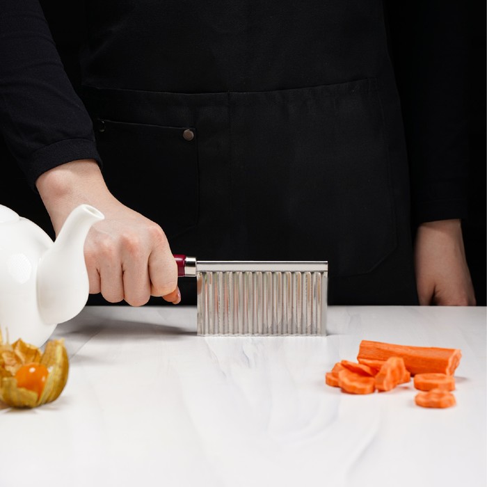 Ножи для декоративной нарезки овощей и фруктов сегодня пользуются популярностью. Изделие имеет характерное лезвие с выпуклыми зубцами по всему прямому полотну. При нарезании продуктов он придаёт поверхности ломтиков красивую волнистую форму.