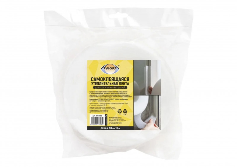 Утеплительная лента для окон и дверей AVIORA 40мм*10м 302-085 представляет собой вспененный уплотнитель для наклеивания по периметру дверей и окон для препятствия образованию сквозняков, для шумоизоляции и снижения теплопотерь в холодные сезоны.
