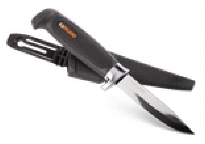 Эргономичная пластиковая двухкомпонентная рукоятка. Пластиковые ножны с поясным креплением.